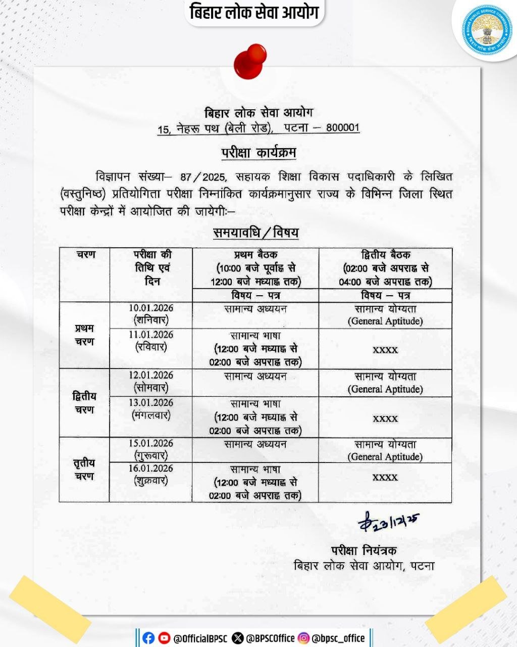 The BPSC AEDO exam will be conducted in multiple shifts across various centers. The official dates are: